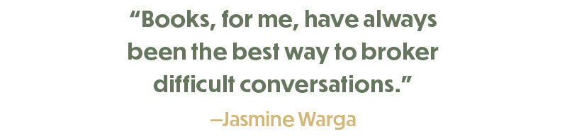 “Books, for me, have always been the best way to broker difficult conversations,” says Warga.