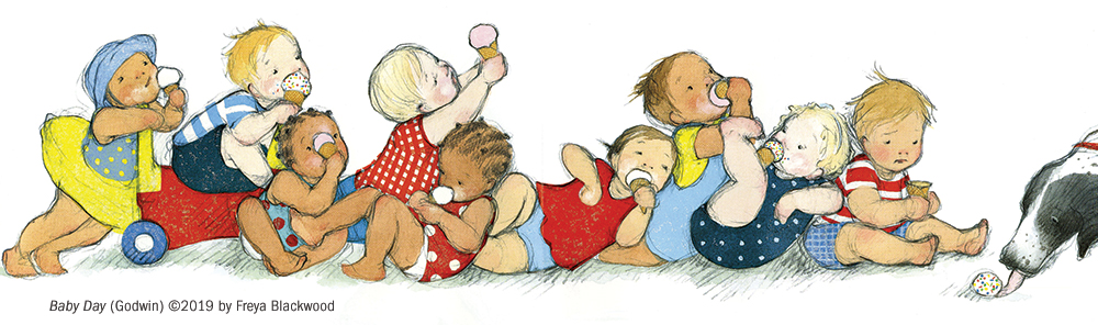 Godwin, Jane & Davina Bell. Baby Day. illus. by Freya Blackwood. S. & S./Atheneum. Mar. 2019. p. 46.