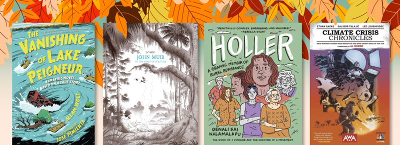 One thing graphic novels are particularly adept at is capturing people encountering the natural world. The visual aspect allows creators both to zoom in for the details of a flower or insect and zoom out on the grand sweep of mountains and oceans, sometimes on the same page. In a similar vein, each of these graphic novels depicts a different aspect of human interaction with nature, juxtaposing individual experiences with the broader picture—one that includes not only beauty and inspiration but also great dangers. From a lushly-illustrated story of how the wildflowers of western Massachusetts inspired the poems of Emily Dickinson to vivid narratives of firefighters, researchers, and policy makers dealing with climate change in their communities, these books show people engaging with the world as explorers, observers, and even protectors.