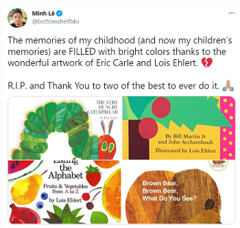 Carle created more than 70 books over 60 decades and sold over 170 million copies. The Very Hungry Caterpillar was published in 1969 and has been translated into over 70 languages. In 2003, He received the Laura Ingalls Wilder Award (now named Children’s Literature Legacy Award). In 2018, Penguin Young Readers established The World of Eric Carle, an imprint dedicated to his work. He has influenced countless readers and future creators over the years. Many from the children's literature world, which was already mourning the loss of Chicka Chicka Boom Boom illustrator Lois Ehlert this week, took to Twitter to share their memories of the man and the impact he had on their careers.