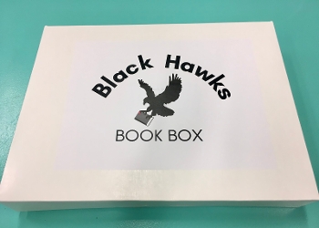 The tissue paper is sealed with a black hawk school mascot sticker and topped with a personalized card with the student's name and book due date.