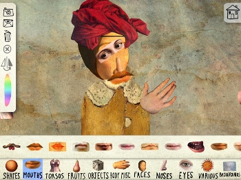 The easy-to-use interface is refreshingly visual and appealing. The landing page has just two basic options: “Create” and “Gallery,” along with small buttons for simple navigation hints and information about the creators. In the first mode the screen becomes a free-form digital canvas with an index of interactive options displayed down the left side of the screen and two rows of thumbnail images running across the bottom. The 200 or so available images are organized into 11 categories represented by the thumbnails. Categories include the basic elements for building collages such as backgrounds, landscapes, fruits, hats, objects, shapes, torsos, and faces. When a category is selected, a scrollable set of images representing specific objects within the set fills the row above. For example, if the “landscapes” category is selected, images of different landscape elements such as mountains, waves, clouds, houses and trees, will appear.