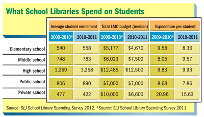 On the other hand, since last year’s survey, book collections have grown slightly, media specialists’ salaries in SLJ’s sample have climbed 10%, and perhaps best of all, the worst budget cuts may be behind us. There are also encouraging local signs.