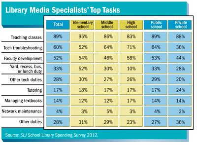 Lean budgets and worries over possible layoffs have prompted many school librarians to volunteer—or administrators have asked them to “volunteer”—for additional duties. On the bright side, some new duties also stretch the potential impact of the person in the role. For instance, media specialists now routinely teach classes: about 89% say they offer instruction, although it’s unclear if they’re teaching traditional library classes or classroom courses. Elementary school librarians tend to teach the most (95%) and those in high schools the least (83%). About a sixth of librarians also tutor students, with roughly 24% of private school librarians leading the way. When it comes to tutoring, there are also significant regional differences, with only 6% of Midwest media specialists offering that type of instruction, compared to 17% in the Northeast, and a robust 22% in the South and 23% in the West.
