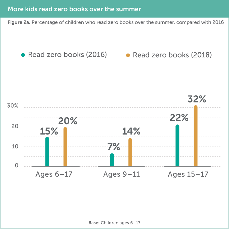 The drop in the number of books read by all ages from the 2016 report is dramatic. Double the percentage of 9 to 11-year-olds, and 10 percent more 15 to 17-year-olds, read no books at all during the break.