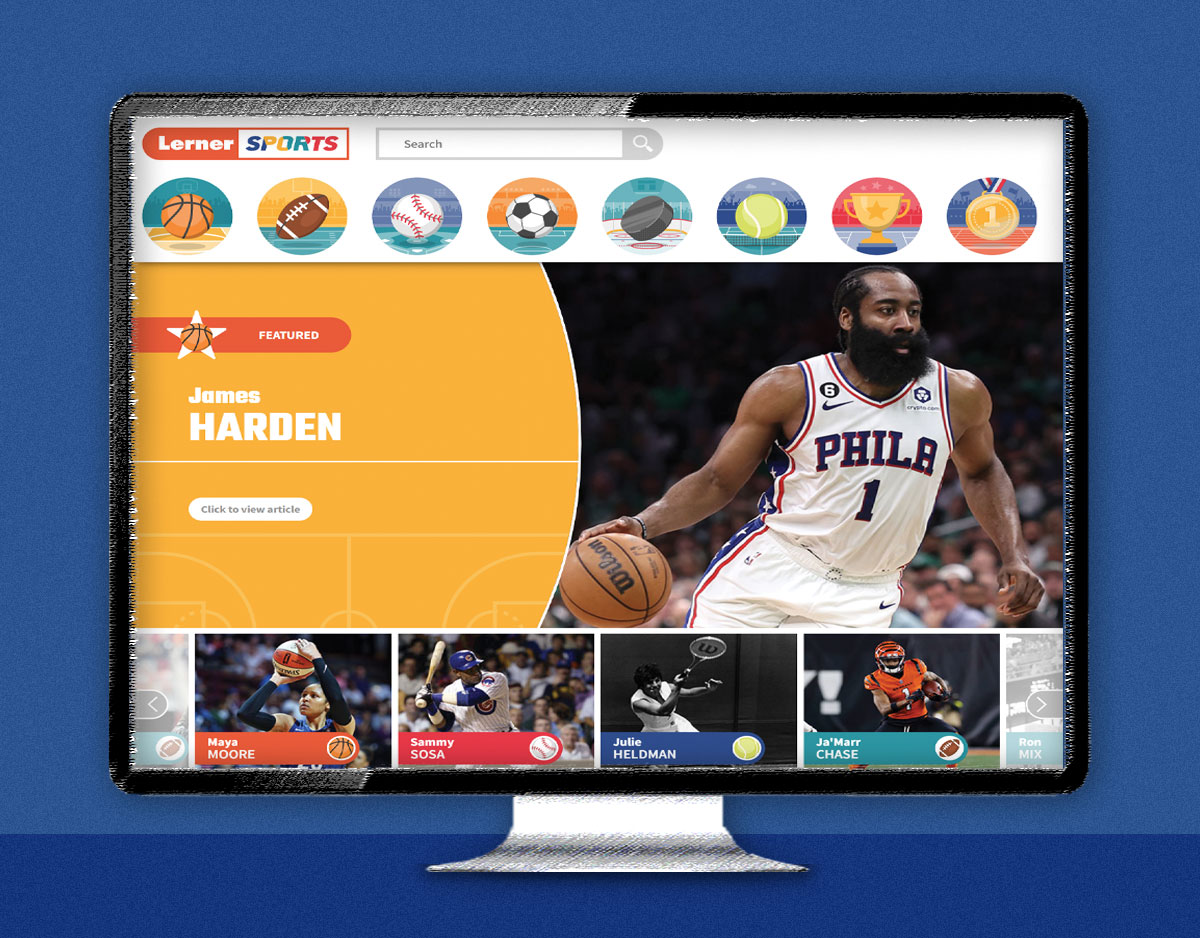 Content At the top of the landing page is a search box for students who already have a subject in mind. Beneath this is a menu strip with icon buttons representing several sports: basketball, American football, baseball, soccer, hockey, and tennis, plus one each for Olympics and “More Sports.” Each button redirects to a menu page with image cards depicting and naming anywhere from a couple dozen to several dozen athletes, teams, or events. This main menu takes up much of the top half of the screen but can be easily minimized to the top with a clearly visible carat button.