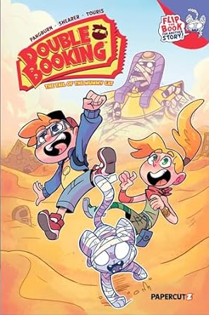 Gr 4-7–How do you describe an adventure involving two siblings who are complete opposites? In a “he said, she said” flip book written by real-life siblings Pangburn and Shearer! Older sister Nan is tall, neat, and wants to be a travel writer just like Mom. Younger brother Otto is short, stocky, messy, and more interested in comics and art camp than a trip to Egypt. The action takes place as they visit a pyramid for their mother’s job. Otto sees the ghosts of a pharaoh and his mummified cat, but Nan doesn’t believe him because they don’t appear to her. First, readers experience Otto’s POV as he tries to deal with these ghostly apparitions, and then they see Nan bewildered by Otto talking to thin air. The illustration style for each half matches the personality of the character whose viewpoint readers are experiencing. Otto’s version has rounded edges and silliness in each scene, much like the “Cat Knight and Dog Woman” comics he draws. Nan’s version matches her idea of herself as a no-nonsense reporter with straight edges, a slightly sinister ambiance, and reinforces Otto’s younger age by always showing him down below Nan’s eye level.