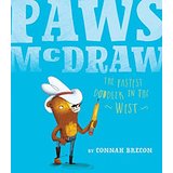 PreS-Gr 2—Brecon depicts the eponymous character's John Wayne-esque artistic exploits in a colorful desert community. Paws McDraw uses his trusty pencil to draw bridges under ill-fated trains, conjure a fire brigade to douse a church fire, and sketch a bucket to retrieve a bunny from a well. His adventures culminate in a showdown with the Rascally Raccoon Gang in which, with a little imagination and help from the town of cupcake-loving bunnies, Paws McDraw is able to save the day. The narrative makes use of sequential art and depicts past events in black-and-white comic strips. The smaller frames of artwork within the story are punctuated by spreads of art showing dynamic motion that threatens to explode off the page. Short bursts of text seem to bounce along, using familiar Western tropes and fun vocabulary in the characters' speech bubbles and conspiratorial asides from the narrator. This is reminiscent of Crockett Johnson's