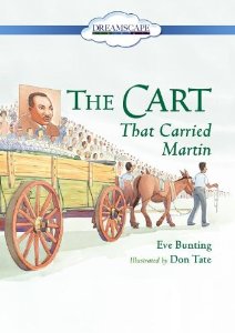 Gr 1–5—Eve Bunting's account (Charlesbridge, 2013) of the humble cart that carried Martin Luther King, Jr.'s casket, here becomes a read-along DVD. The treatment of Don Tate's artwork is the best thing about this presentation. Moving shots of the illustrations, rather than static ones, reflect the magnitude of the day's events and the size of the crowds along the funeral procession route. Beyond that, the book is not satisfactorily represented. The read-along text contains at least four spelling errors and one punctuation mistake. Sean Crisden's narration is also problematic. At first, it has a friendly, reassuring lilt, which might make the somber content more palatable for younger listeners. But as the book progresses, Crisden's voice becomes too upbeat in jarring contrast to the solemn text, especially the passage describing King's coffin and his spirit. Crisden varies his voice to a degree as different characters speak, but it's not always fitting. On the other hand, the muted sounds of church bells, wagon wheels, the mules' hooves, the singing of hymns, and the murmur of the crowd are effective accompaniments.—
