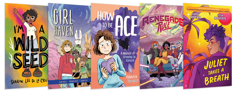 If there is one notable development in recent LGBTQIA+ graphic novels, it’s that they are following the rest of the medium in becoming more diverse in terms of characters and stories. Tien, in Trung Le Nguyen’s The Magic Fish, is a member of a Vietnamese immigrant family and wrestles with not only whether to come out to his parents but whether they will understand what that means. Juliet, the protagonist of Gabby Rivera’s Juliet Takes a Breath, finds dismay and acceptance when she comes out to her large Puerto Rican family, while her journey to Portland, OR, brings her a new view of the politics of gender and color. And in How To Be Ace, Rebecca Burgess writes about her asexual identity, an orientation that hasn’t been fully represented in media until recently.