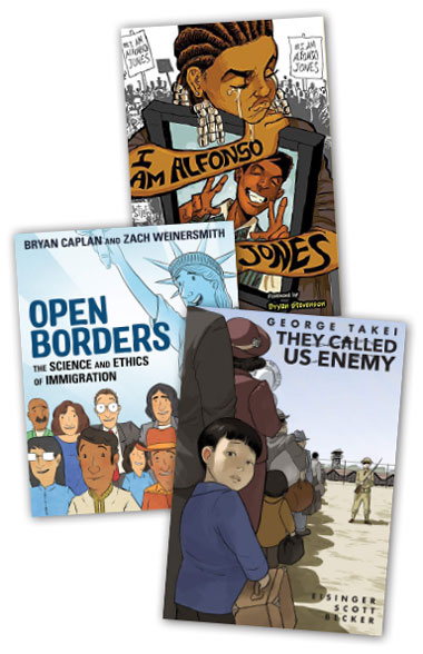 In Bryan Caplan and Zach Weinersmith’s Open Borders: The Science and Ethics of Immigration (First Second, 2019), which argues that we shouldn’t put restrictions on the movements of immigrants, , incarceration rates, population statistics, and voting patterns—dry numbers when expressed in prose—become not only comprehensible but memorable. Abstract concepts such as fiscal collapse, cultural disintegration, and the relationship between IQ and production (insert crossed-eyes emoji here!) are gracefully and even humorously communicated via visual metaphor. A huge amount of intelligence is conferred via a few fun panels in this work that’s best for high schoolers or advanced middle school kids.