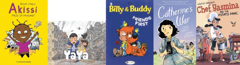 “Akissi” by Marguerite Abouet. illus. by Mathieu Sapin. Nobrow/Flying Eye, 2018-20. “The Ballad of Yaya” by Jean-Marie Omont & others. illus. by Golo Zhao. Magnetic Pr., 2019-20. “Bigby Bear” by Philippe Coudray. illus. by author. Humanoids/BiG, 2019-20. “Billy & Buddy” by Jean Roba. illus. by author. Cinebook, 2013-19. “Castle in the Stars” by Alex Alice. illus. by author. First Second, 2017-20. Catherine’s War by Julia Billet. illus. by Claire Fauvel. HarperAlley, 2020. Chef Yasmina and the Potato Panic by Wauter Mannaert. illus. by author. First Second, 2021.