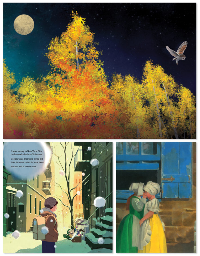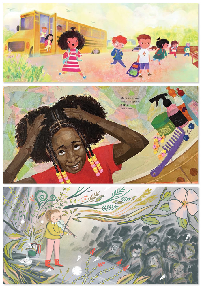 From the top: Sobel's First Day, Hooray! illus. by Nabila Adani;Oso's My Hair Is a Book. illus. by London Ladd;White's Brave Like Fireweed. illus. by Jesse White |