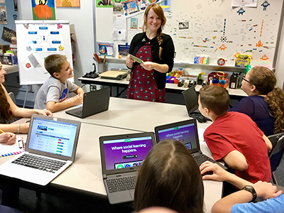 Schilpp has brought a global perspective to her rural students. Using technology such as Skype or Flipgrid, her kids connect with children and educators in Hawaii, Australia, England, and China. When students were having a hard time engaging with a geography lesson, Schilpp collaborated with NMS sixth grade teachers Angie Rush and Lisa Carr to add a real-world element. Using Flipgrid, the classes connect with students of fellow librarians Schilpp met on Twitter. They nicknamed this digital citizenship experience “What in the WORLD are we reading?” Through this, Schilpp models positive online interactions, and students from different parts of the world present about their hometowns and favorite reads.