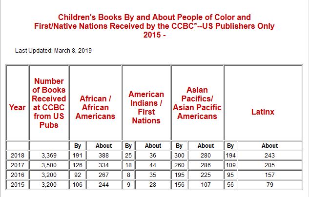 “We are continuing to gather those numbers, but the 2018 publishing year marked a change in how we are doing it. Rather than keeping track only of books we receive that are by and about people of color and from First/Native Nations, we are documenting the content of EVERY book we receive, making note not just of race and ethnicity, including whiteness, but of many other aspects of identity, from whether main characters are LGBTQ+ to their religion (when indicated), to whether the book is about a non-human character.