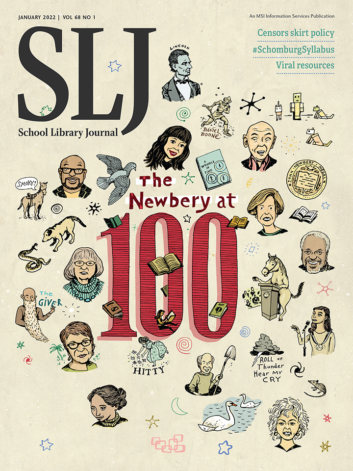 SLJ's January 2022 cover celebrates the Newbery centenary. Illustrator John S. Dykes festooned the image with visual references to some of the groundbreaking, iconic moments from 100 years of the award honoring the best in American literature for children. Bonus points if you can ID the notable people and events pictured.
