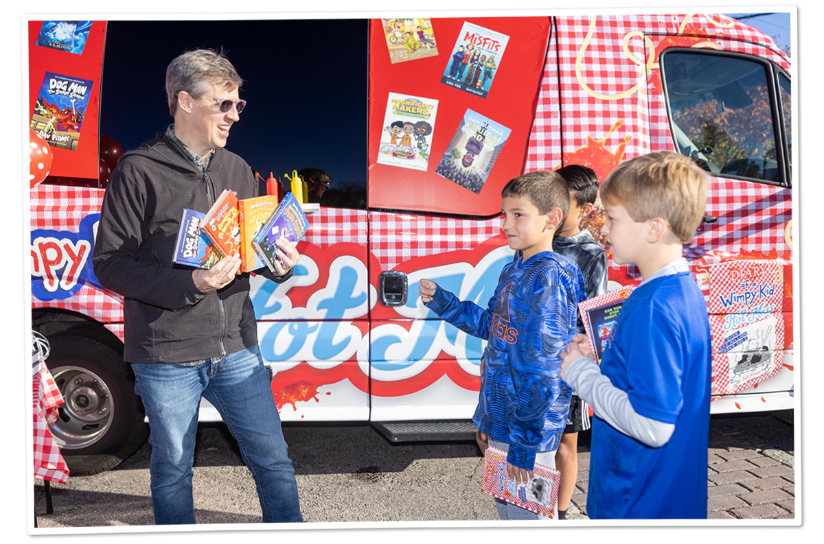 For Diary of a Wimpy Kid: Hot Mess, the 19th book in the best-selling series, Kinney scheduled a tour of 14 interactive shows, as well as three planned school events and at least five spontaneous pop-ups along the tour route, stopping at bookstores, libraries, and outdoor areas. At the schools and pop-up visits, Kinney will give kids the opportunity to choose a free book from a diverse collection provided by First Book.