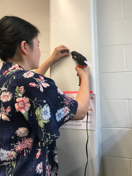 As Leonardo da Vinci once said, “Simplicity is the ultimate sophistication.” Staying true to this theme, we channeled simplicity into an innovative display method for our library at Western Albemarle High School (WAHS) in Crozet, VA, where we are students. Educators often want to display student creations, but struggle with how to hang artwork on painted concrete walls like the ones in our school library. Sticky putty and tape are temporary methods, but they don’t last, and bulletin board space runs out very quickly. So at the WAHS library, we are using a new display method. It is a simple solution to the difficulties of showcasing student artwork. All you need are engineer print enlargements, a hot glue gun, metal washers, and super magnets.