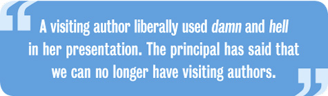 Last year we had a writer visit our elementary school, and she liberally used damn and hell in her presentation. The principal has said that we can no longer have visiting authors. The students and their parents are wondering which writer will visit this year. What do I tell them? I would tell them the truth. Explain that the principal was unhappy with parts of the presentation and is now uncomfortable having visiting writers. I suspect that parents and students who were pleased with the program will approach the principal and urge them to change their mind. I don’t know in what context the writer used the words, but an entire program shouldn’t be shut down because one writer may have forgotten their audience. This places undue blame on all writers, and students lose out.