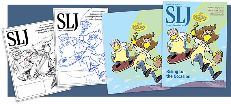 “If [the SLJ cover] is one panel in the comic,” he responded, “the next panel would show Lunch Lady and Betty valiantly sticking up for their students. It is within the fabric of their nature, just as it is with the real-world superheroes who serve our students, be they in a physical classroom or appearing over Zoom.”