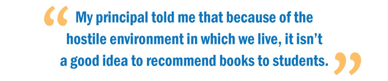 The mother of a fourth grader complained to my principal that I gave her son a book she finds offensive. The principal reprimanded me and told me that because of the hostile environment in which we live, it isn’t a good idea to recommend books to students. He said, “Let them find the books on their own.”