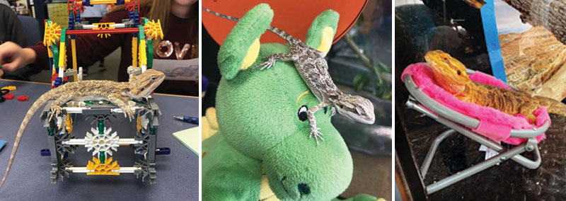 From left: Dewey participates in a K'Next competition; Dewey with a dragon stuffie; Lizzie the Lizard relaxing at Oak Hill Elementary School. |