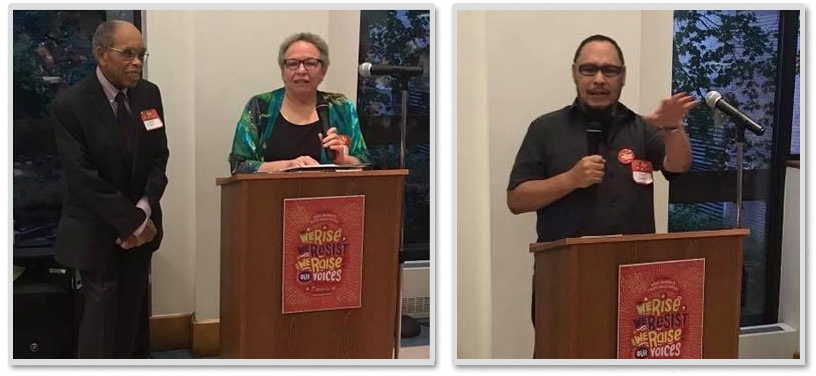 George and Bernette Ford (left) and Floyd Cooper were guest speakers at the Just Us Books 30th anniversary celebration in 2018. The event, held at the Schomburg Center for Research in Black Culture, also launched the anthology We Rise, We Resist, We Raise Our Voices, with works by Bernette Ford, Cooper, and Arnold Adolf. |