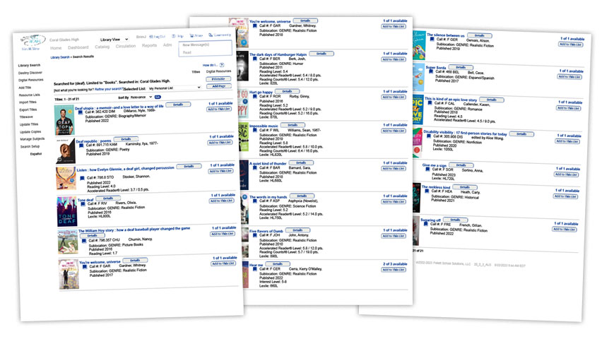 Finding books for my displays used to be a chore. Our district uses Follet Destiny to catalog books. A general search in Destiny using terms like “deaf” and “hearing loss” frequently omitted books I knew I had in my collection. Some simply weren’t tagged that way in the system, and I often found myself searching endlessly through the database and scanning the shelves instead for books that fit the theme.