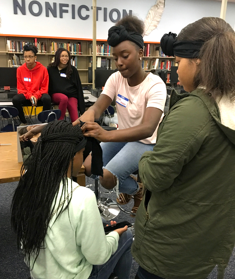 Head wrapping has historically been a part of African dress. What began as a way to protect the head from the scorching sun has emerged as a cultural symbol throughout the African diaspora, including the United States. Using donated T-shirts for material, students ran a popular head wrapping station. Volunteers educated other students about the evolving symbolism of headscarves while helping wrap the finished cloths around students’ heads. I also suggest using discounted fabric rolls from a craft store instead of T-shirts.