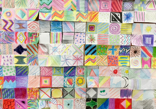 Art students also helped with a kente making station. Kente cloth patterns originated in Ghana, and different pattern combinations convey various meanings. We displayed information about how colors and patterns together create meaning in the cloth. Black represents Africa; red, the blood of forefathers; yellow stands for gold; and green, the forest. The geometric patterns relate to the beliefs and history of the Ashanti people. After studying this information, students designed and colored strips of pre-cut paper and added to the communal board.