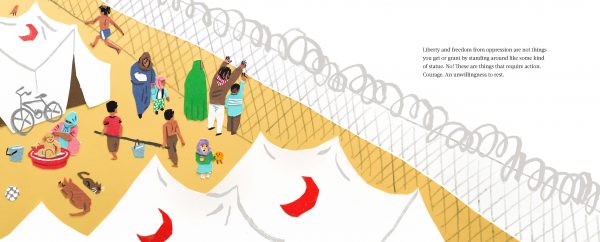 In Her Right Foot, the immigrant and refugee experience is captured with a two-page spread of a Red Crescent camp in Syria, where refugees receive protection and supplies while waiting for a country to grant them asylum. “I knew it might be a controversial, political spread to include in a picture book,” Harris explains. “I thought it was a really important image for kids and their adults to see, because it connects the statue to today’s news. These are some people [who are deeply] affected by that argument Stephen Miller and Jim Acosta were having on our screens the other day.” The idea for the book came to Eggers when he and his family were on the ferry to Liberty Island one morning to visit the statue. “It was cold and rainy, and we were surrounded by hundreds of people speaking dozens of languages,” he said in a press release. “We were all soaked—we were actually the huddled masses going to Liberty Island….The Statue of Liberty’s position of action and welcome—striding into the sea to meet new arrivals—struck me as crucial to remember,” he said. Miller’s recent focus on the statue took Eggers and Harris by surprise. “It was pretty wild to watch a debate in the White House briefing room about what the Statue of Liberty means,” says Harris. “I’ve been immersed in just that question all year.” The statue “means something very personal to nearly everyone,” says the book’s editor, Taylor Norman. “[Miller’s comments] exposed exactly how precisely interpretation is tailored to experience and perspective.” Chronicle is inviting parents, teachers, and librarians to download an excerpt of Her Right Foot to share with children 12 and under—and to create a picture showing what the Statue of Liberty means to them for a chance to win a signed copy of the book and a letter from Eggers.We are currently offering this content for free. Sign up now to activate your personal profile, where you can save articles for future viewing
