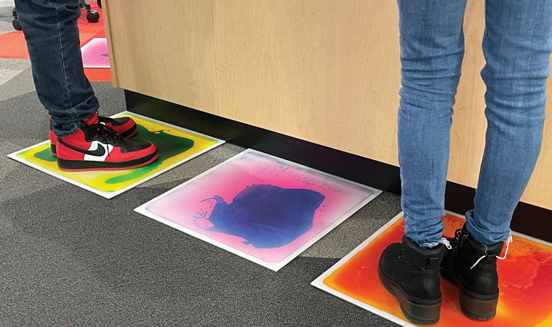 At the circulation desk, students encounter a number of sensory tiles placed on the floor. “Often mistaken for artwork, these tiles are incredibly fun to squish. Students love to watch the colored liquid move and dance,” Trudeau says. The tiles were originally purchased as a way to support students who struggled to wait their turn, she says, “but we’ve found that they also give students a reason to stop by—for a quick squish with their feet and a hello to our staff.”