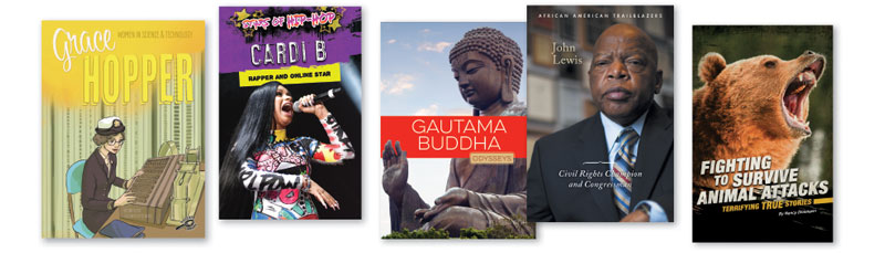 Popular contemporary figures and classic report topics represent the latest in biographical series. Hip-hop stars, the royal family, and prominent living women such as Katherine Johnson and Megan Smith are featured, as are many people who survived fantastic and dangerous encounters with nature, animals, and war. Classic report figures such as Gandhi, Nelson Mandela, George Washington, Elizabeth Blackwell, Benjamin Franklin, Queen Elizabeth, Thomas Edison, and Frederick Douglass have new renditions. Those in primary grades will get to know American folk heroes and the founding fathers. Some books are introductions for youngsters while others contain report information for older readers; a few provide interesting reads.