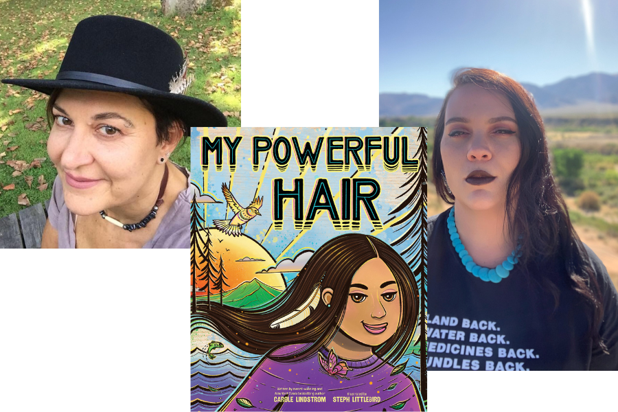 Photo of Carole Lindstrom, cover of book My Powerful Hair, photo of Steph Littlebird