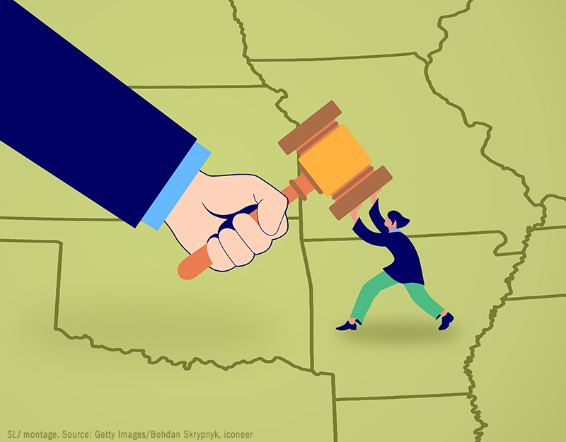 Illustration of a librarian standing on a map (over Arkansas) pushing back at gavel coming down on them.