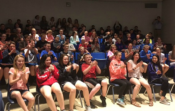 Seventh graders at Tolland (CT) Middle School are thrilled to see who their surprise guest is.
