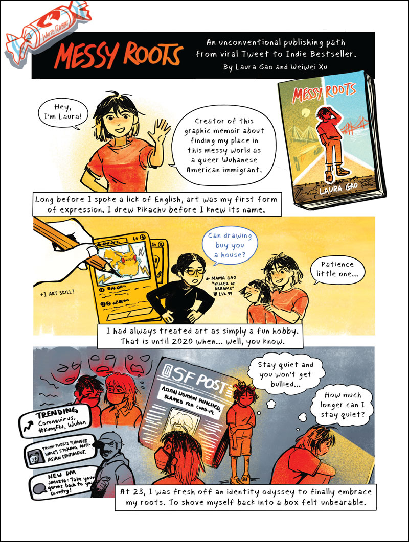 With her graphic memoir Messy Roots, Laura Gao followed an unconventional publishing path from viral tweet to indie bestseller. She illustrates her path to publication in this SLJ-original comic.