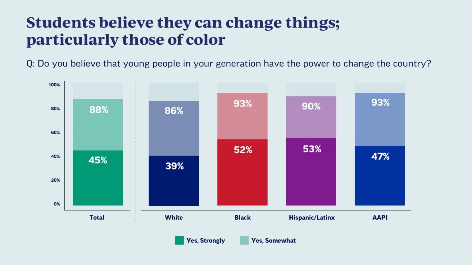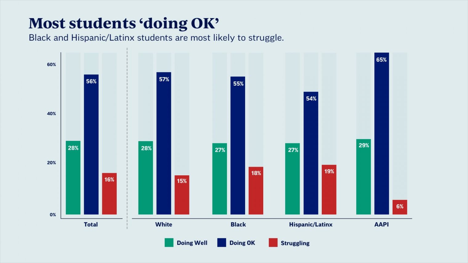 While more than half of the students (56 percent) say they and their families are "doing OK" and just 16 percent report struggling, only 32 percent say they are doing well academically. The majority of students (88 percent) report trusting their educators to teach them this year and 76 percent say they are getting a good education despite the circumstances. The survey polled more than 1,300 students age 13-18.