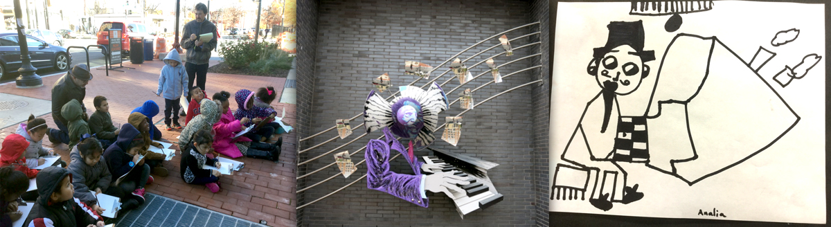 From l. to r.: Students from Seaton Elementary sketching a sculpture while in dialog with the artist (in fedora), Zachary Oxman; A portion of Oxman’s sculpture, “Symphony in DC Major,” featuring famous city resident, Duke Ellington; A finished portrait of the Duke. |
