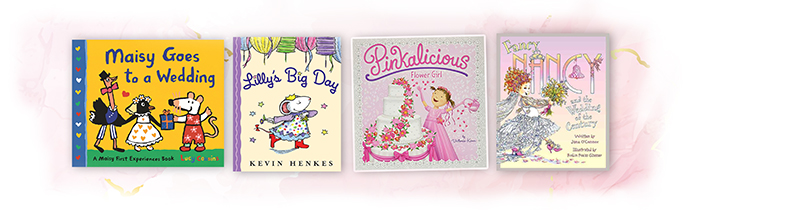 Part of “Maisy’s First Experiences” books, this entry follows the little mouse as she attends her first wedding. Fancy clothes, music, flowers, speeches, dancing, and a tossed bouquet—this work matter-of-factly presents all the must-have details that mark the special day. The bright, familiar palette will get kids in the right mindset for the big day.