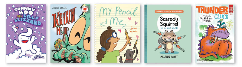 This variety extends to format as well, with graphic novels that range from short and simple enough for the youngest reader to longer and more complex stories that approach the level of the Dog Man books, whose age range of seven to ten overlaps with the early reader category. Almost all are divided into short chapters, making the length of each one less intimidating. For the most part, the text is simple and easily decoded, although creators will often toss in one or two new words, and books targeted at ages five and up (as opposed to four and up) generally have a wider vocabulary.