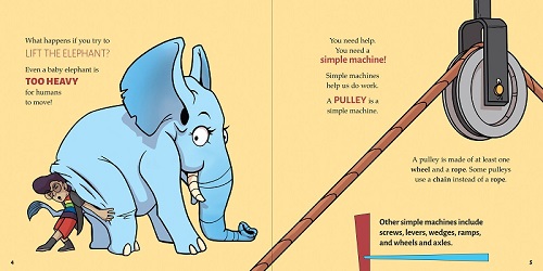 I tried to bring all the wonder I feel about simple machines to these picture books through a few different elements. Funny examples of why you’d need a simple machine (like an elephant sitting on your book!). Explorations of early examples of simple machines (the first wheels were potters’ wheels!). Simple demonstrations (clap your hands together and rub—that heat you feel is friction at work!).