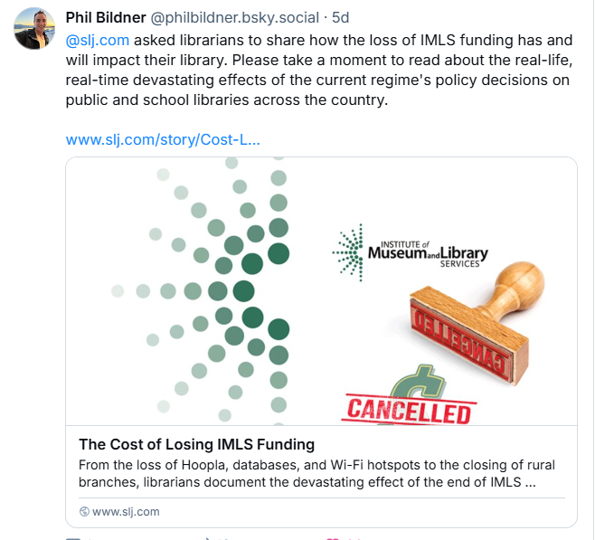 @slj.com asked librarians to share how the loss of IMLS funding has and will impact their library. Please take a moment to read about the real-life, real-time devastating effects of the current regime's policy decisions on public and school libraries across the country.
