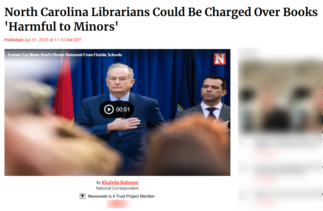 The April 1 Newsweek piece, "North Carolina Librarians Could Be Charged Over Books 'Harmful to Minors'" was featured in SLJ's Censorship News column. |