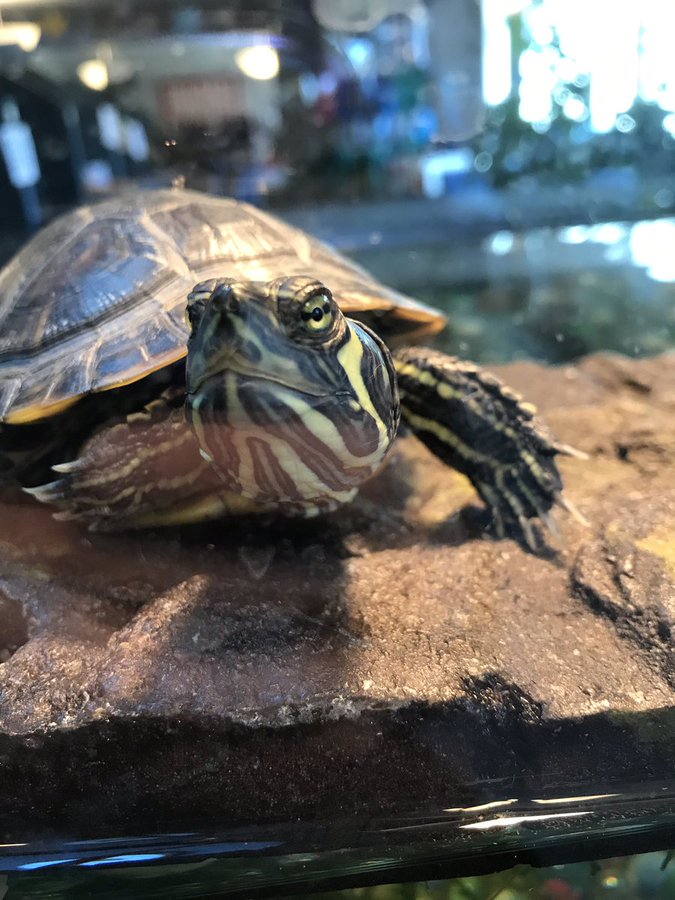 Hello! I am a yellow-bellied slider turtle! My species lives in the wild in the southeastern United States, but I was hatched by a breeder and came from a local pet store. There is no record of my exact hatching date, so my friends chose a birthday for me—April 17!—because everyone deserves a shellebration every once in a while. I turned two years old this past April, and my friends threw me a party and gifted many beautiful marbles for my tank. They catch the light, and when you clack them together, they make music!