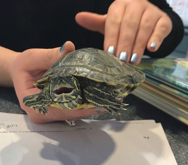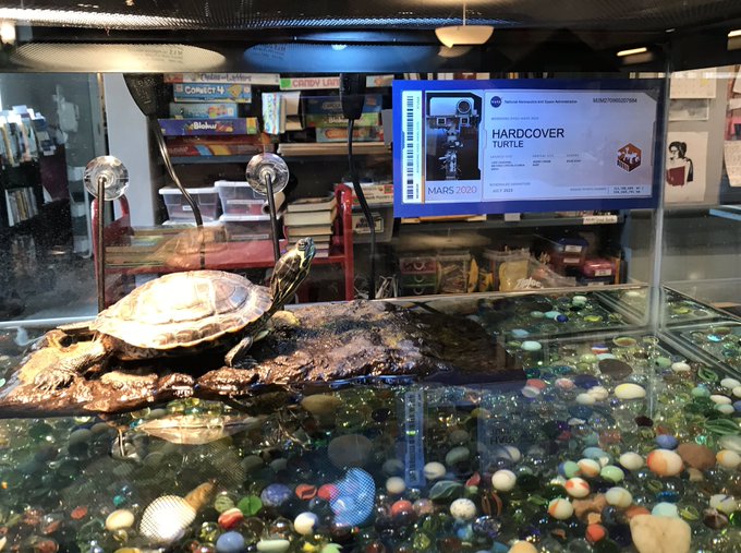 I wake up when the sun shines through the window and throws a rainbow through my tank. When my staff comes in for the day, I make sure to greet them with splashes. I get breakfast on Monday, Wednesday, and Friday, and then settle in for the daily pre-opening staff meeting, where my input is always valued. I am located in the children’s department of the library, so I have the important task of greeting the humans that enter the room. I swim up to greet them at the side of my tank, sometimes splash a hello, sometimes just blink. I make sure to take frequent naps under my sun lamp—which is good to keep my shell from getting shell rot, and also to help with seasonal depression in the winter. (Mental health is just as important as physical health!) Throughout the day, I also check in with my friends on Twitter, make sure that my fish are happy and healthy, and take the time to check in with my staff and let them know that they’re doing a good job.