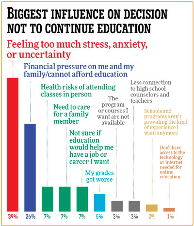 That unpredictability placed a major toll on students’ decision-making, says Leigh. When they were asked about the biggest influences for taking a break before post-secondary education, stress, anxiety, and uncertainty were leading factors, mentioned by 39 percent of respondents.