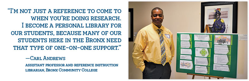 Providing personal guidance is a practice that Carl Andrews, assistant professor and reference instruction librarian, takes to heart while working with young people entering Bronx Community College (BCC) in New York City. Since 2013, Andrews has spearheaded freshman library orientation, which plays a major role in the school’s college transition efforts. The majority of students are of Hispanic, Afro-Caribbean, West African, and African American descent—a reflection of the demographics of the South Bronx, says Andrews.
