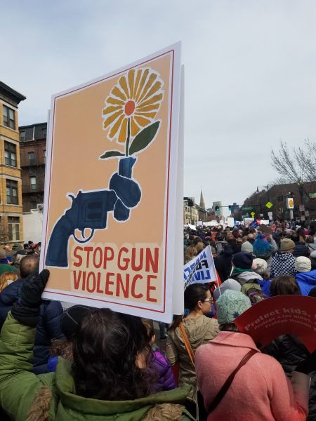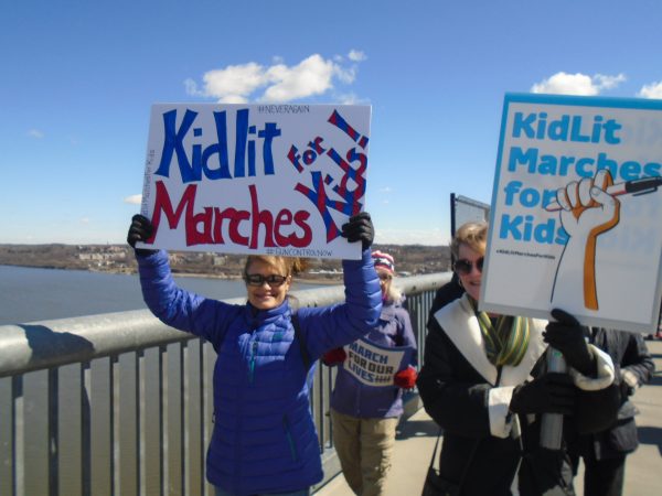 Author Jenny Han, left, holding banner, coordinated the New York City group of #KidLitMarchesForKids. Photo by Justin Chanda.