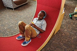 Wonderbooks come with a headphone jack for independent listening and can be charged using a micro-USB charging port. The Wonderbook catalog features a diverse collection of more than 650 titles, including both fiction and nonfiction content for children ages three to thirteen, as well as a collection of large print chapter books.
